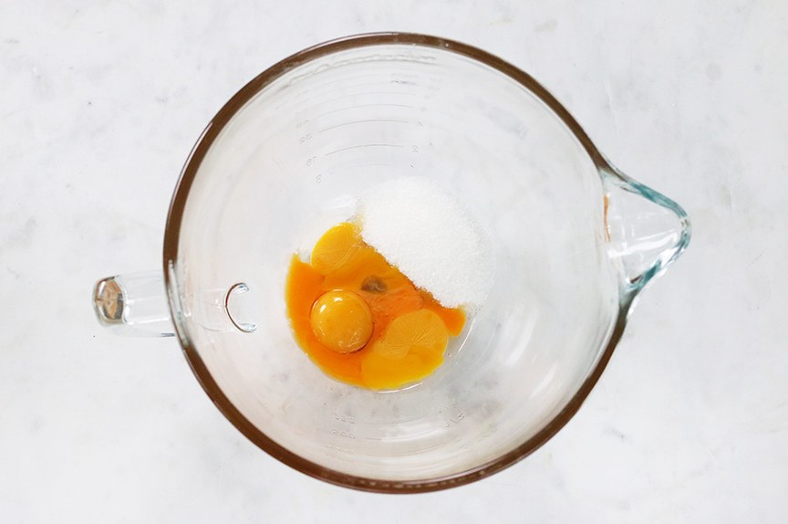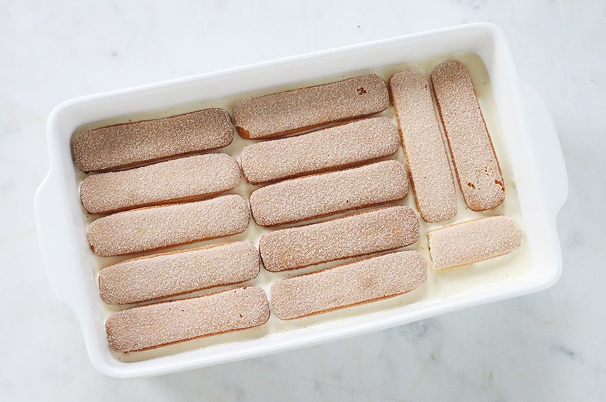 Splits de eieren (het eiwit heb je niet meer nodig maar je kunt er b.v. lekkere schuimpjes of pavlova van maken). Mix de eidooiers met de suiker 3 minuutjes tot er een licht geel mengsel is ontstaan. Voeg de mascarpone beetje bij beetje toe tot deze is opgenomen en er geen klontjes meer in zitten.