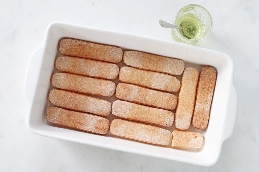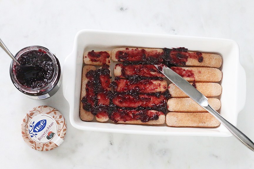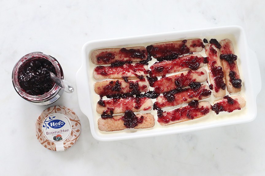 Er kwam bij deze tiramisu geen koffie aan te pas maar ik besprenkelde de lange vingers met Limoncello. Dit Italiaanse likeurtje maakt het extra fris. Je kunt dit ook eventueel weglaten mocht je de tiramisu alcoholvrij willen maken of de Limoncello vervangen door bijvoorbeeld een beetje citroensap. Vervolgens besmeerde ik de lange vingers met een laagje Hero Bosvruchtenjam. Deze bestaat uit een mix van frambozen, boysenbessen, bramen en bosbessen gemengd met suiker, citroen en pectine uit vruchten. Geheel natuurlijk dus. Bekijk hier nog meer feestelijke recepten met jam.