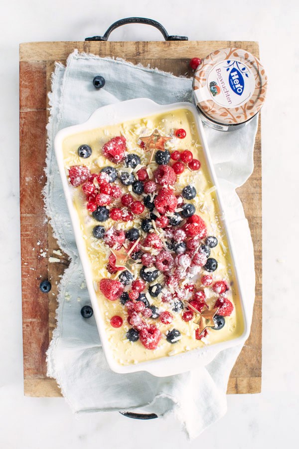 Garnering: geraspte witte chocolade, frambozen, blauwe bessen, aalbessen, poedersuiker