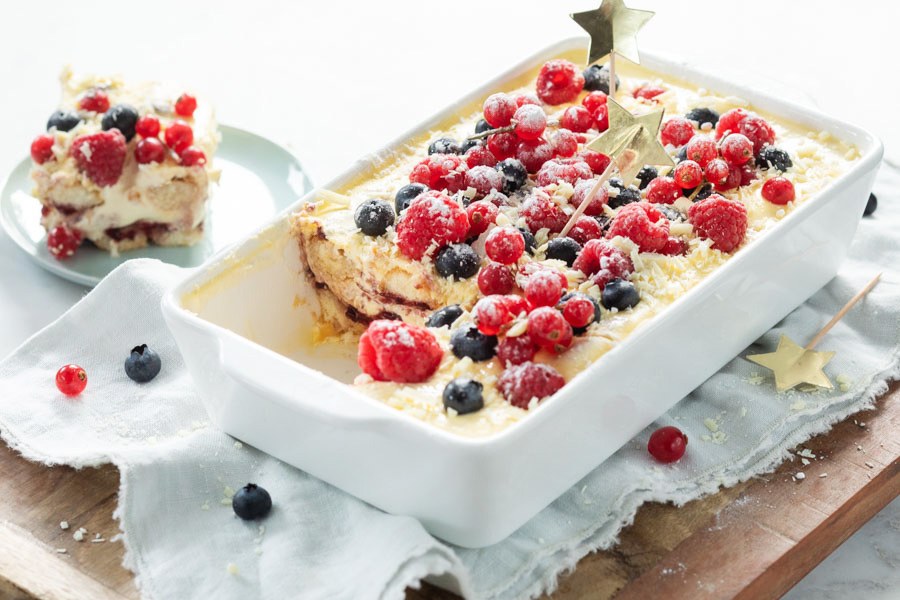 Feestelijke kerst tiramisu met bosvruchten