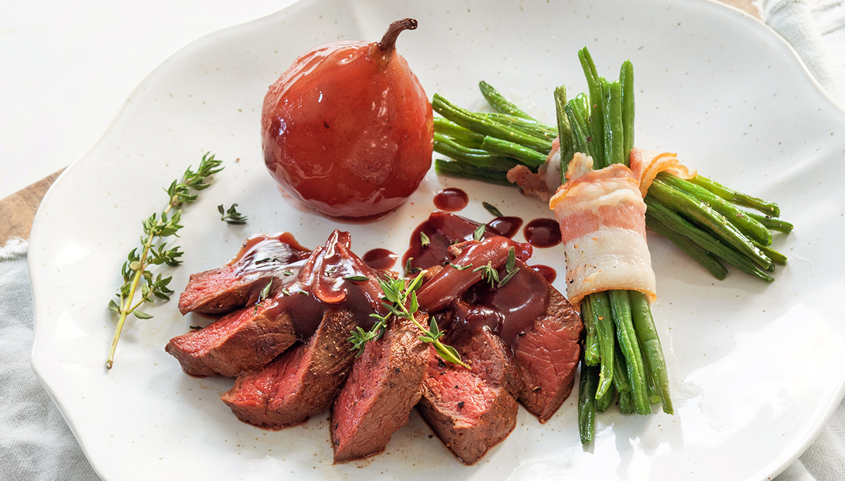 Dit recept voor hertenbiefstuk met rode portsaus en stoofperen is perfect voor een wat luxer diner. Ik maak het zelf regelmatig voor een kerstdiner en dan maakt het altijd indruk. Maar het kan ook zeker op andere gelegenheden, zoals een avondje thuis of een etentje met familie of vrienden. Het fijne aan dit gerecht is dat het helemaal niet moeilijk is om te maken en je kunt het al binnen 35 minuten serveren!