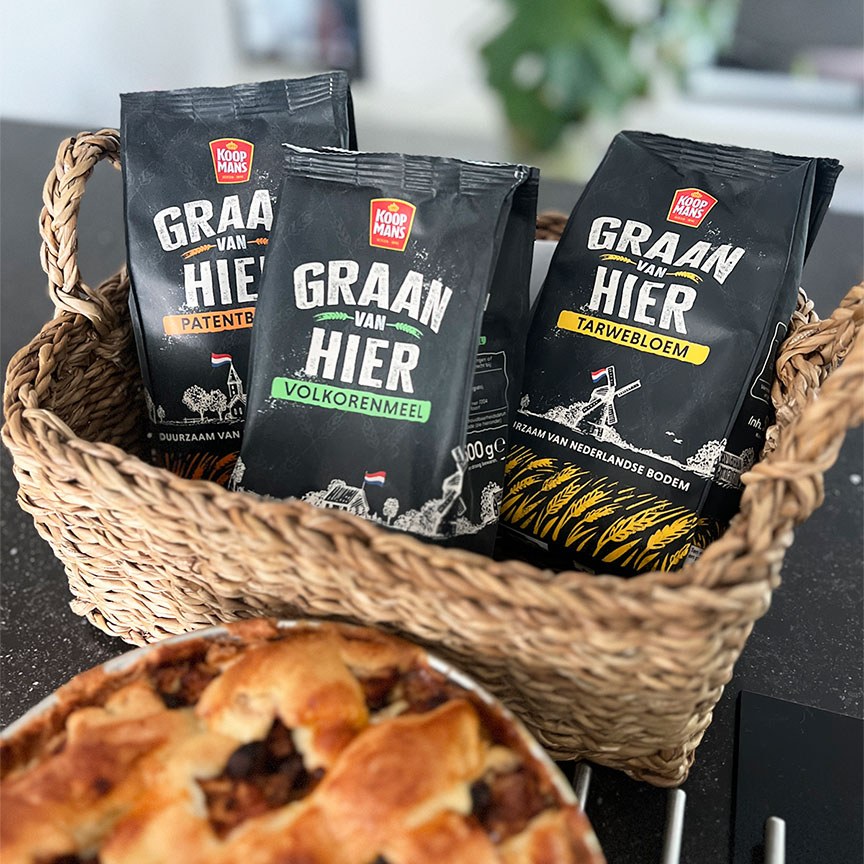 Koopmans heeft 3 nieuwe producten met Graan van hier. Duurzaam geteeld op Nederlandse bodem. Hij is er in een volkorenmeel, tarwebloem en patentbloem variant en verkrijgbaar in de grotere supermarkten.