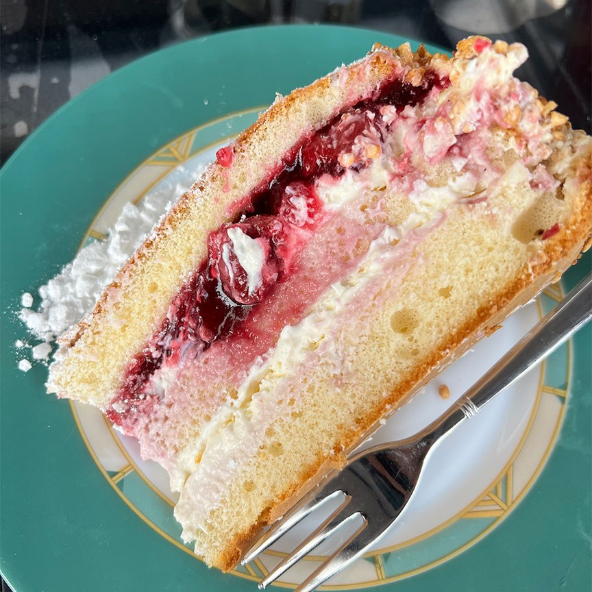 Ook mijn vader was jarig en daar at ik een groot stuk bienenstich, een luchtige cake met een romige vulling met kersen. Ik ben opgegroeid in Limburg en mijn ouders wonen daar nog steeds, dus elke verjaardag is een perfecte kans om een stuk echte lekkere vlaai of deze bienenstich te eten.