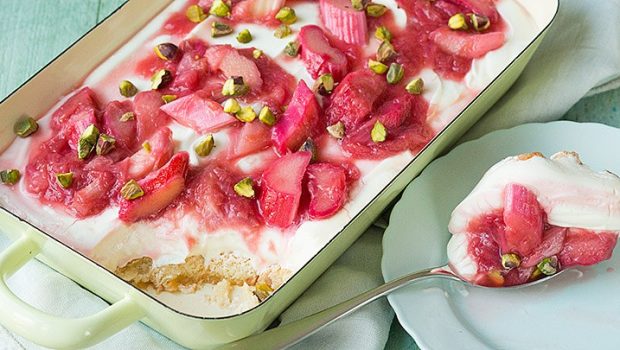 Fris en zoet tiramisu recept met laagjes lange vingers, romige kwark en gekarameliseerde rabarber
