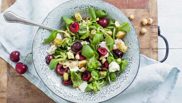 Verse kersen zijn heerlijk in deze frisse en zomerse salade met mozzarella, croutons, hazelnoten en een balsamico dressing.