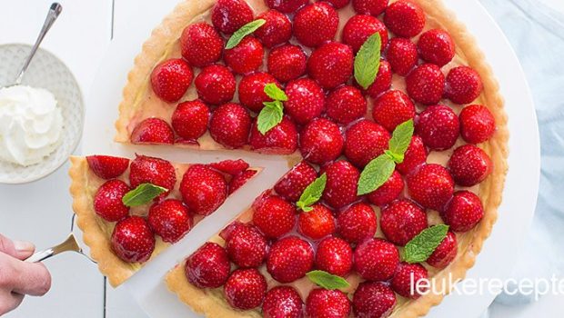 Deze vlaai met een romige vulling van banketbakkersroom en verse aardbeien is niet al te zoet en heerlijk op een zomerse dag