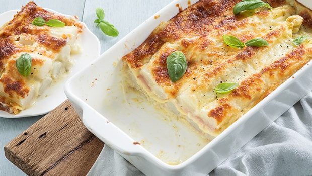Witte asperges met ham zijn een gouden combi, zeker in deze romige aspergelasagne met bechamelsaus met pesto