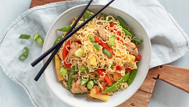 Lekkere Oosterse roerbak met kip en verse groenten in een lekkere Oosterse saus geserveerd met noedels, lekker en simpel! Ideaal voor een makkelijke doordeweekse dag.