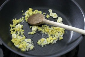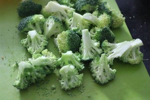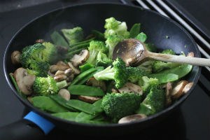 Laat dit goed doorkoken tot de saus net iets dikker wordt. Breng dan op smaak met chilipoeder en zet het vuur uit. Snijd roosjes van de broccoli, plakjes van de champignons en maak de peultjes schoon.