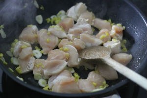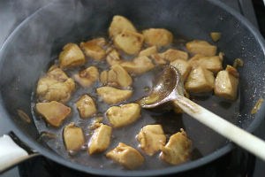 Kook de rijst volgens de aanwijzingen van de verpakking. Hak de gember en knoflook zeer fijn en snijd de kipfilet in blokjes. Fruit nu de gember en knoflook ongeveer 2 minuten aan en voeg dan de kip toe. Bak deze in ongeveer 4 minuten goudbruin, deze hoeft nog niet gaar te zijn. Voeg nu honing, sojasaus, water en met daarin opgeloste maĆÆzena toe.