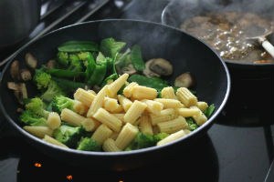 Roerbak al deze groenten in een wok met een beetje olie. Wanneer de groenten beetgaar zijn, voeg je de baby maĆÆs in stukjes toe samen met de woksaus en kip. Verwarm nog even goed door en serveer met de witte rijst.