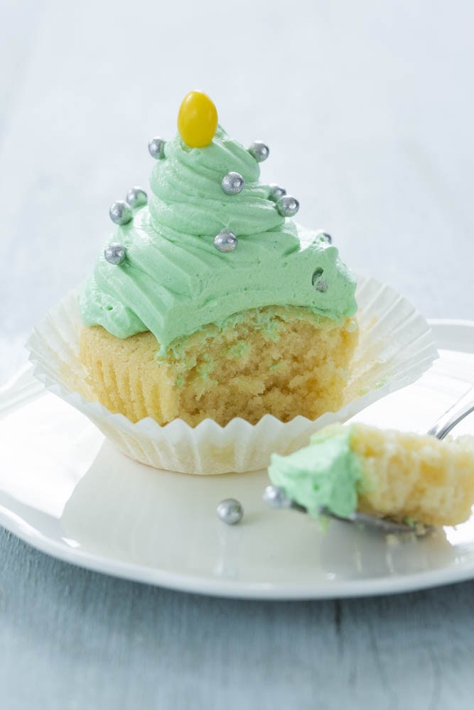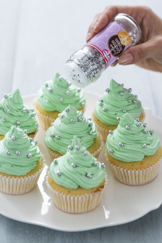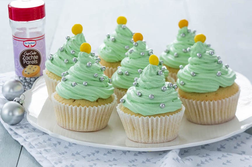 Bestrooi met wat zilveren parels en doe een gele M&M of Jellybean bovenop de kerstboom cupcakes.