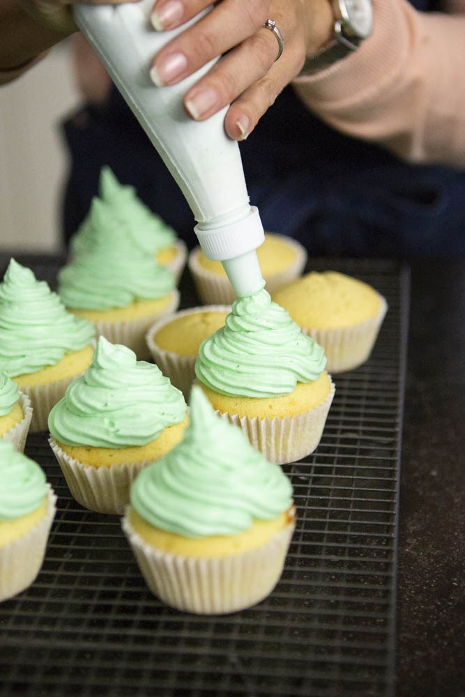 Bereid de cupcakes volgens de verpakking en laat ze daarna afkoelen op een rooster. Mix ondertussen de mix voor botercrĆØme met de kleurstoffen, melk en boter door elkaar. Voeg beetje bij beetje de kleuren toe om een mooie kleur groen te krijgen. Doe de botercrĆØme in een spuitzak met kartelspuitmondje en maak mooie hoge toeven op de cupcakes.