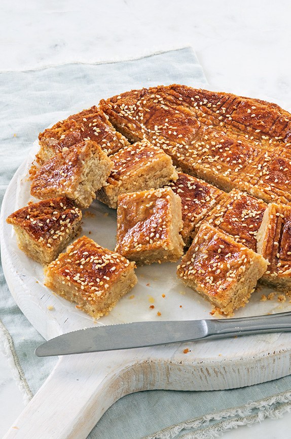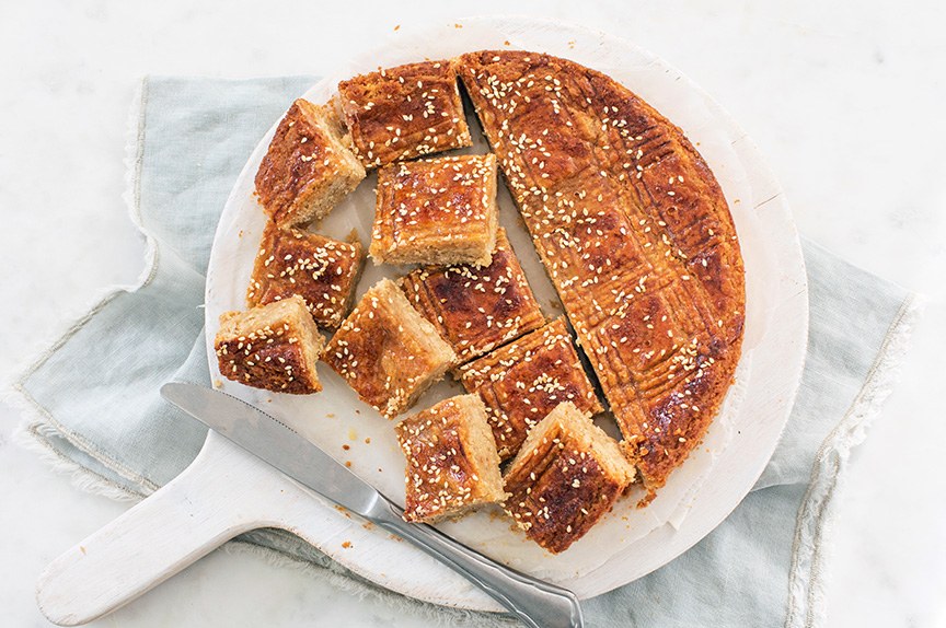 Bestrijk de bovenzijde met het losgeklopte ei. Maak met een vork een ruitpatroon in de bovenkant van de boterkoek. Bak de chebakia boterkoek 30 tot 35 minuten in de oven tot de koek goudbruin is. Smeer de bovenzijde van de koek in met honing. Garneer met sesamzaad en laat daarna volledig afkoelen.