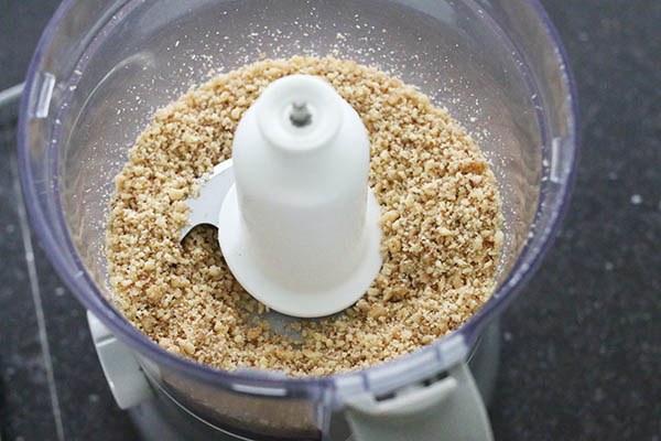 Verwarm de oven op 175 graden. Doe de amandelen en walnoten in een hakmolen en maal fijn. Klop het ei los in een kleine kom.
