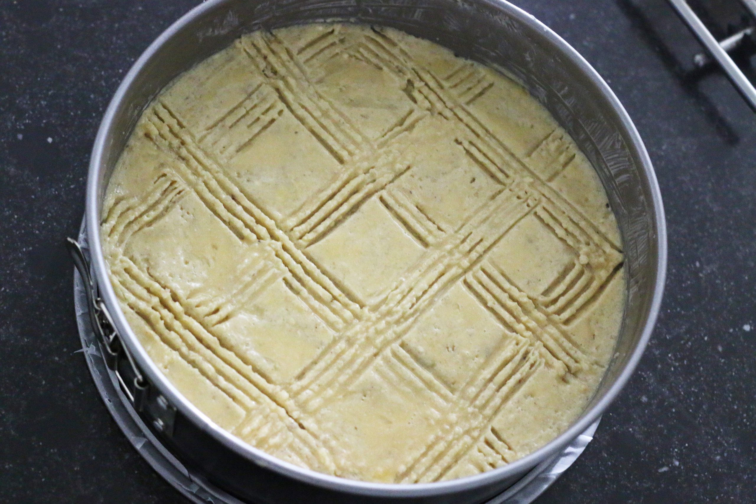 Doe het deeg in de springvorm die bekleed is met bakpapier. Spreid het deeg met de achterkant van een lepel gelijkmatig uit. Tip: gebruik bakpapier om te voorkomen dat het deeg aan de lepel plakt.