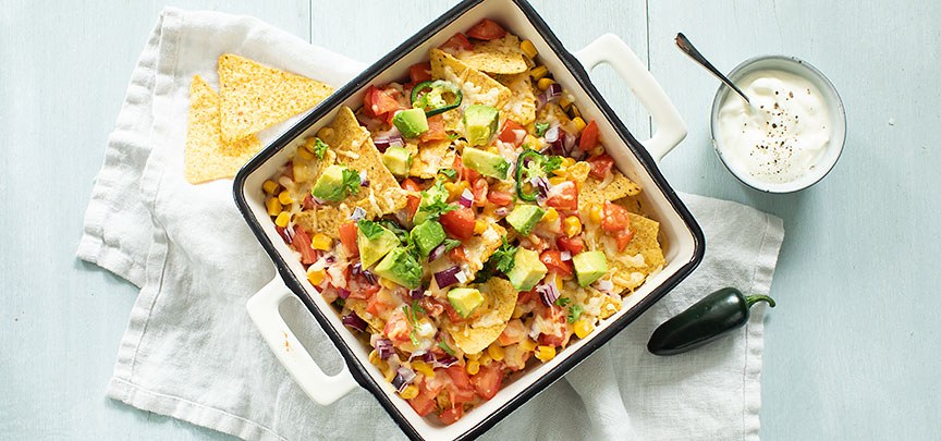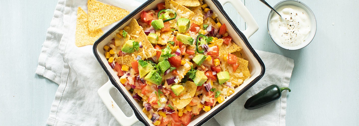 Zelf nachos maken met dit makkelijke en snelle recept voor Mexicaanse nacho's uit de oven. Met tortilla chips, tomaat, avocado en maïs onder lekker veel gegratineerde kaas. Een topper op elk feestje of gewoon lekker samen op de bank.