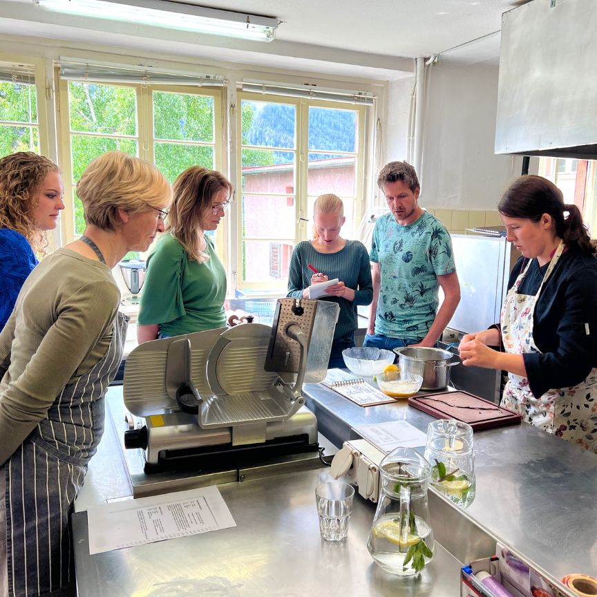 Donderdag bezochten we een kleine kaasmakerij. We leerden hoe kaas wordt gemaakt van melk van lokale Alpenkoeien en hoe de kazen in de kelder rijpen onder perfecte omstandigheden. ’s Middags was het tijd om onze notentaart te proeven en leerde Michaela ons hoe je snijbietrolletjes maakt met een vulling van deeg en gebakken groenten, geserveerd met een romige kaassaus. Dat was meteen ons diner voor die dag.