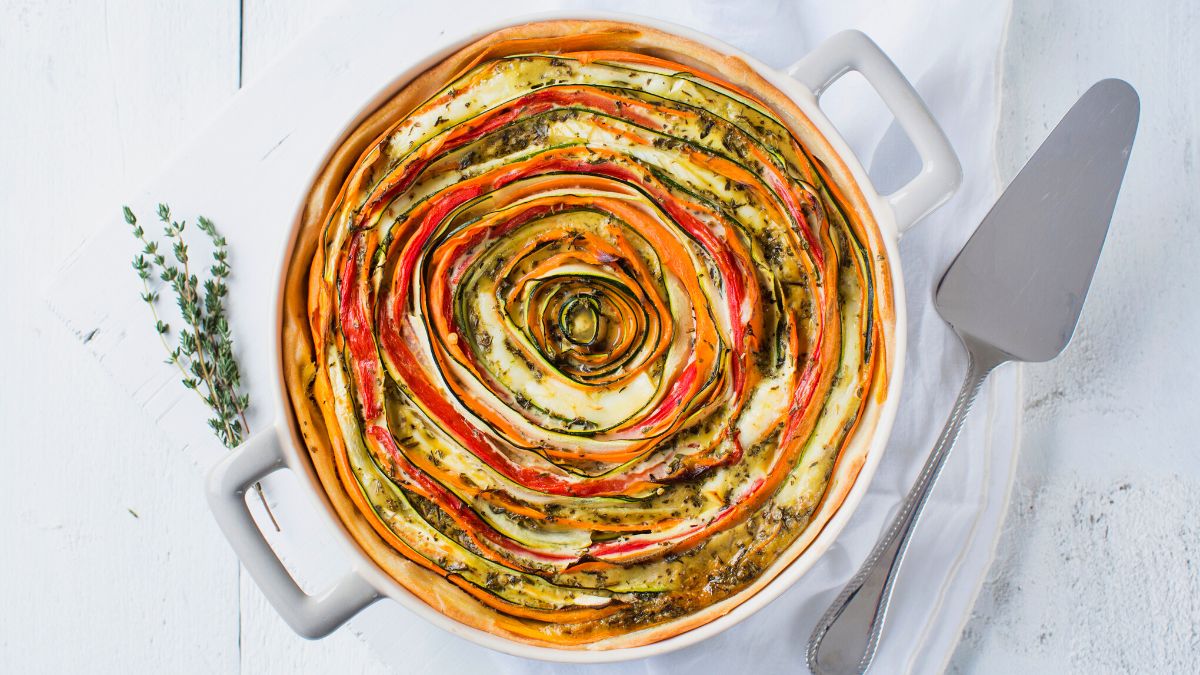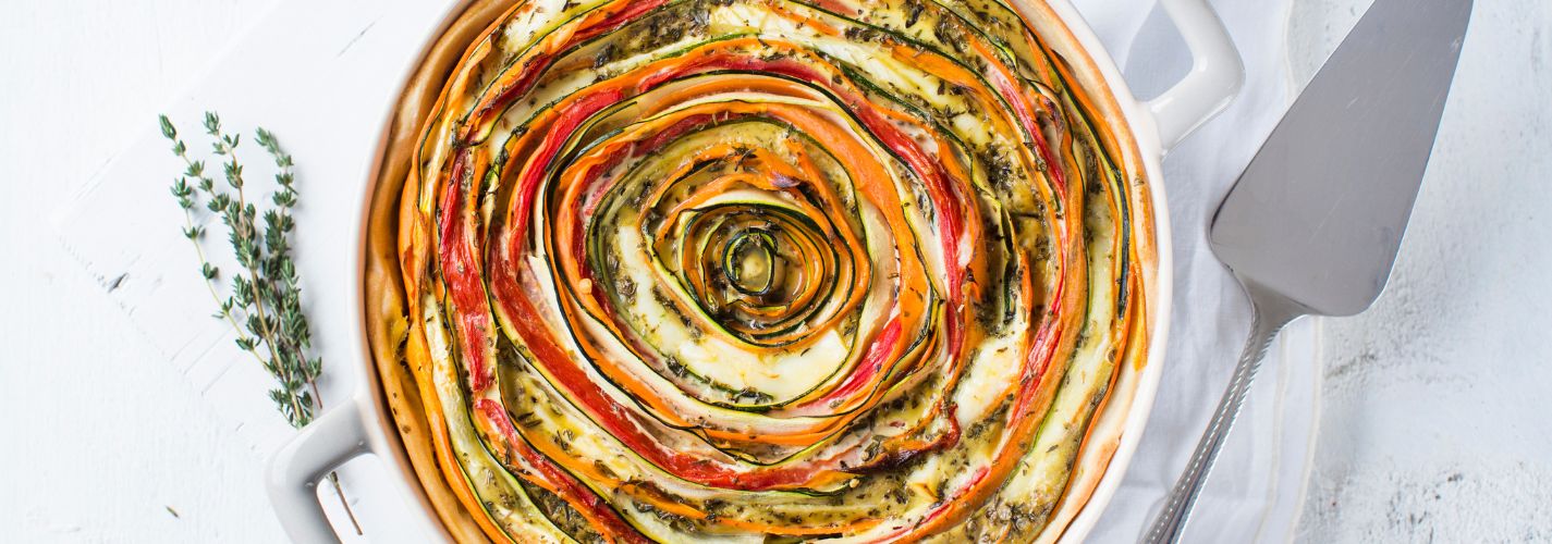 Deze hartige taart met brie is niet alleen prachtig om te zien, maar ook erg lekker en vol met groenten. In 20 minuten zet je hem in de oven.