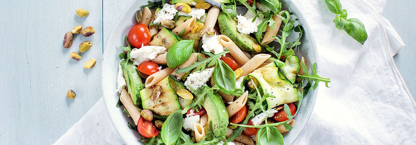 Een lekkere en gezonde pastasalade gemaakt met o.a. volkoren pasta en groenten zoals tomaatjes, courgette en avocado. Simpel en verantwoord!