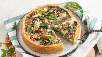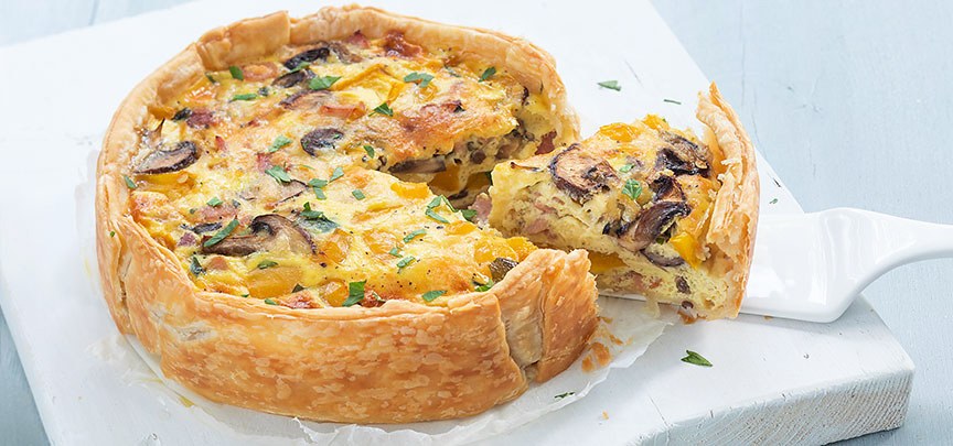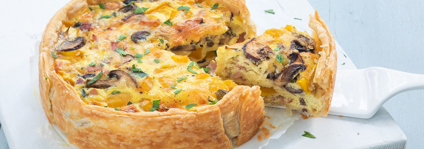Dit hartige taartje van bladerdeeg gevuld met champignons, spekjes en paprika is lekker als lunch of avondmaal