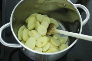 1. Fruit de fijngehakte knoflook aan in een soeppan met een beetje olie of boter. Voeg de aardappels in schijfjes of stukje toe en bak een paar minuutjes mee.