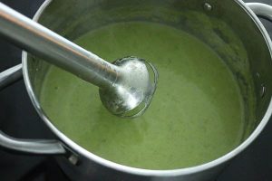 3. Pureer de soep fijn met een staafmixer. Voeg de room toe en roer er doorheen. Breng de soep op smaak met een snuf peper en indien nodig een beetje zout.