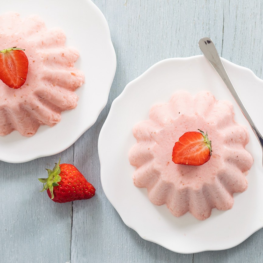 8. Doe wat warm water in een kom en houd de onderkant van de vormpjes kort hierin zodat de aardbeien bavarois makkelijk los komt. Stort de bavarois daarna op een bordje.