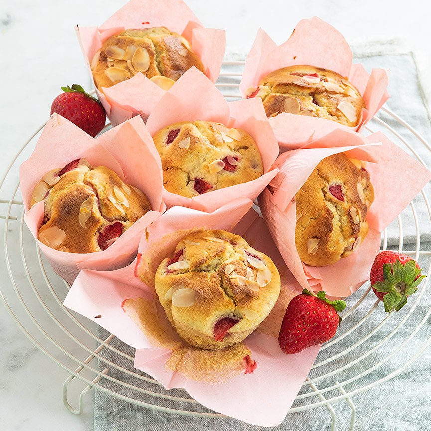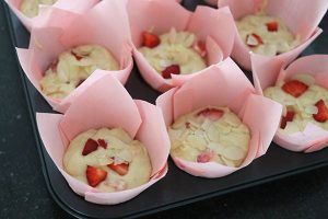 2. Vul de muffinvormpjes met het beslag. Verdeel nog wat laatste stukjes aardbei er over en de amandel. Bak de muffins ca 20 tot 25 minuten in de oven tot de goudbruin en gaar zijn. Laat ze vervolgens afkoelen. Ook lekker met wat gesmolten witte chocolade er over.