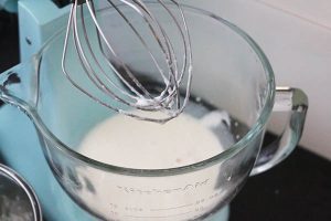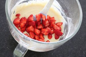1. Verwarm de oven op 190 graden. Doe de slagroom in een kom en voeg de suiker en vanille toe. Klop met een garde (of kort met de mixer) door elkaar. Kluts de eieren erbij en mix er ook kort door. Zeef het bakmeel bij het natte mengsel en spatel er kort door. Snijd de aardbeien, spatel deze kort door het beslag (bewaar een paar voor de topping).