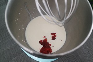 Daarna nog een keer geprobeerd en maar een klein beetje van het aardbeienmengsel bij de slagroom gedaan en dat ging beter.