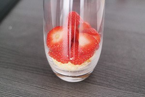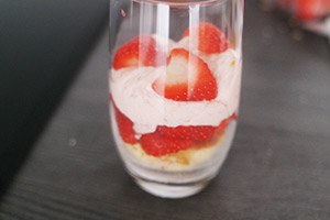 1. Snijd 250 gr aardbeien in plakjes en doe deze met de suiker en citroensap in een pan en breng zachtjes aan de kook. Als de aardbeien zacht zijn kun je ze met de vork kapot drukken zodat er een rode saus ontstaat. Week de gelatine in koud water en knijp daarna uit Voeg de gelatine toe aan de aardbeien en laat het mengsel daarna afkoelen (niet in de koelkast). Mix de slagroom kort en voeg dan beetje bij beetje de aardbeien ‘jam’ toe tot deze is opgenomen.