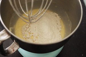 5. Voeg de yoghurt en de gesmolten boter of margarine toe en mix er 2 minuutjes doorheen.