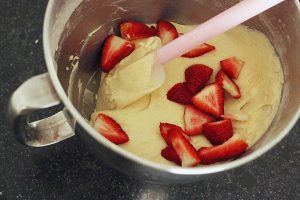 6. Voeg dan het zelfrijzend bakmeel toe en mix er nog kort door. Schep de helft van de aardbeien door het beslag.