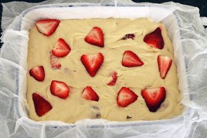 8. Verdeel het beslag over de bakvorm. Verdeel dan de rest van de aardbeien er over.