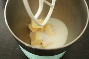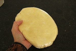 1. Doe de boter en suiker in een kom en mix door elkaar. Voeg dan het ei toe daarna de bloem en het snufje zout toe. Mix tot een kruimelig deeg. Kneed er daarna een bal van. Wikkel deze in folie en leg 30 min in de koelkast.