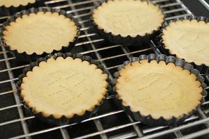 6. Bekleed de vormpjes met het deeg. Prik met een vork gaatjes in de bodem en bak de bodems ca. 20 min in de oven. Haal ze uit de oven en laat afkoelen.
