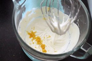 3. Mix de mascarpone met de vanillesuiker, citroenrasp, citroensap en de slagroom tot een romig mengsel. Zet in de koelkast totdat de taartbodem is afgekoeld.