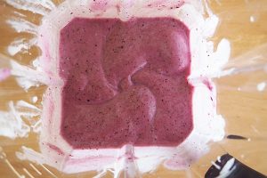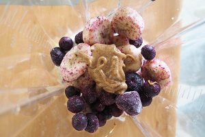 1. Doe de ingrediënten voor de smoothie in een blender: de (bevroren) banaan, blauwe bessen, Griekse yoghurt, acaï en amandelpasta. Blend dit tot een gladde smoothie.