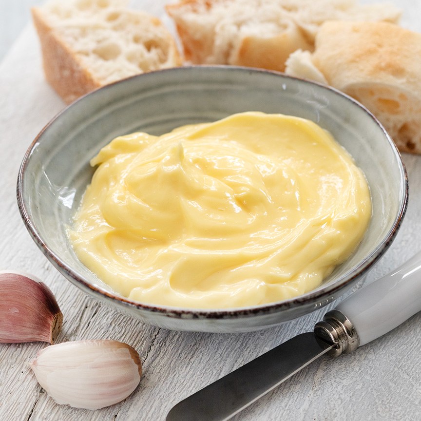 1. Begin met het pellen van de knoflookteen en snijd deze fijn. Leg de eidooiers in een hoge en smalle kom, dit is ideaal voor het gebruik van een staafmixer. Voeg de fijngesneden knoflook toe aan de eidooiers samen met de azijn en een snufje zout.