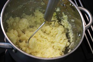 1. Kook de aardappels gaar in 15 minuten. Stamp ze fijn met een stamper. Giet een flinke scheut warme melk er bij, snuf peper en zout en voeg de andijvie toe en roer goed door tot alles goed gemengd is. Laat nog een paar min zachtjes door verwarmen zodat de andijvie wat slinkt.