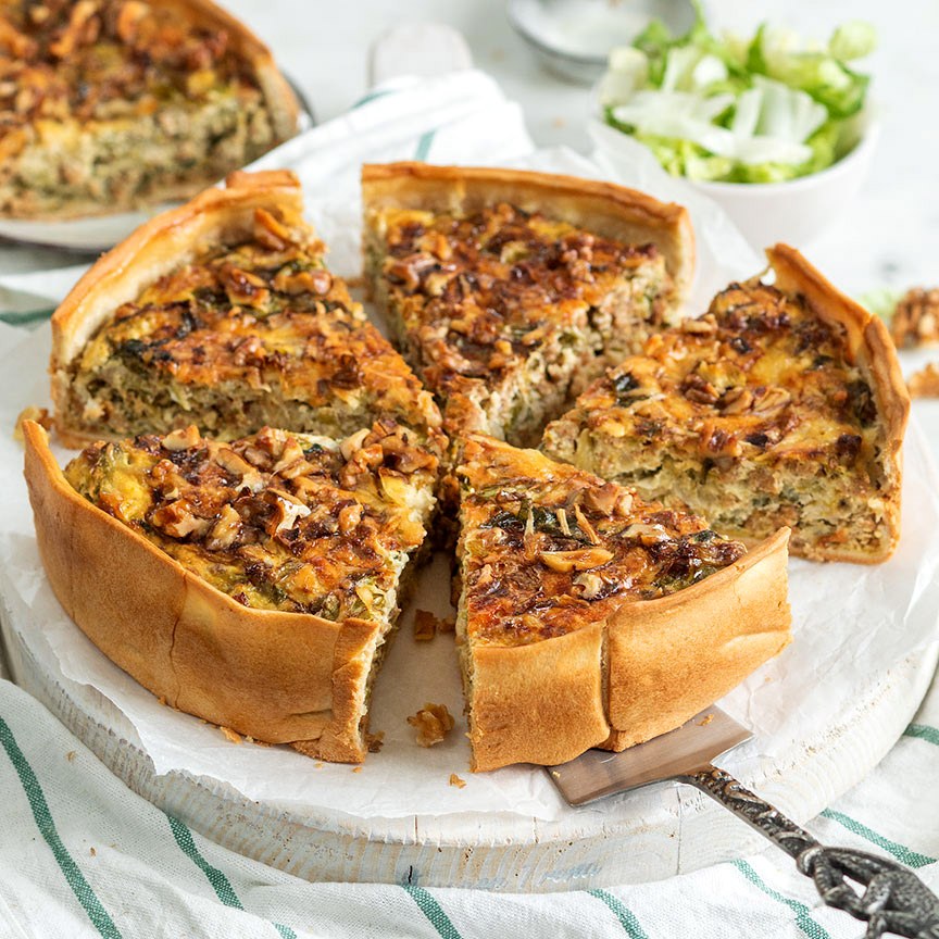 7. Klop in een kom de eieren los met de room en een snuf peper en zout. Voeg het gehaktmengsel uit de pan hieraan toe samen met ⅔ van de kaas en de grof gehakte walnoten. Meng door elkaar. Giet dit mengsel in de bekleedde quichevorm. Bestrooi met de overgebleven kaas en zet de quiche ca. 50 minuten in de oven.