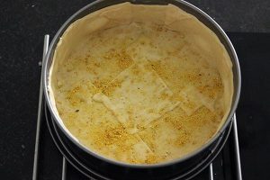 4. Bekleed de vorm met de plakken deeg. Laat de randen iets overlappen en druk deze goed aan. Prik gaatjes met een vork in de bodem en bestrooi met paneermeel.