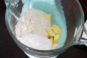 2. Klop het ei en mix de helft van het ei samen met de boter, het zelfrijzend bakmeel, de basterdsuiker, de vanillesuiker en het snufje zout tot een egaal deeg. Is het erg plakkerig? Voeg dan nog een beetje bakmeel toe. Is het erg droog? Voeg dan nog een beetje boter toe.