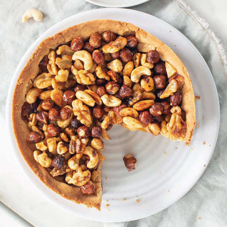 14. Doe deze ongeveer 10 minuten voordat de taart klaar is. Smelt het klontje boter voor de topping en voeg er de honing aan toe. Neem een hittebestendig schaaltje en plaats daar de noten in. Zodra de boter en honing met elkaar vermengd is, voeg je deze toe aan de noten. Roer het goed door elkaar.