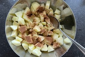 2. Doe de appelstukjes in een kom en voeg de maïzena, kaneel en suiker toe en roer erdoor.