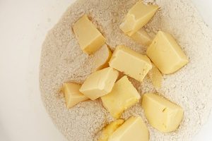3. Doe de bloem, zout en suiker in een kom. Voeg hier de koude boter in stukjes aan toe. Meng dit met je vingers door elkaar tot een kruimelig deeg.