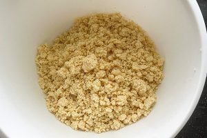 5. Doe het appelmengsel in de ovenschaal en verdeel de deegkruimels er over.