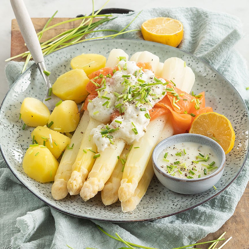 6. Serveer de asperges op een bord met de aardappeltjes ernaast. Verdeel de gerookte zalm er over en schep wat bieslooksaus erop. Garneer met wat extra bieslook en serveer met een halve citroen die je eventueel over het gerecht kunt uitknijpen.