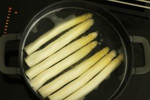 3. Breng een (asperge)pan aan de kook met water. Leg de asperges erin en kook ze in ca. 5 min gaar, afhankelijk van de dikte. Giet daarna af en vang het kookvocht op. Houd de asperges warm onder een deksel.